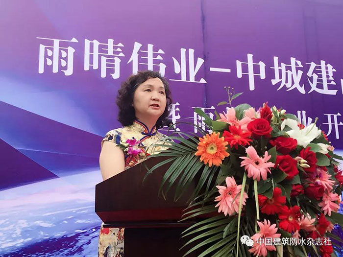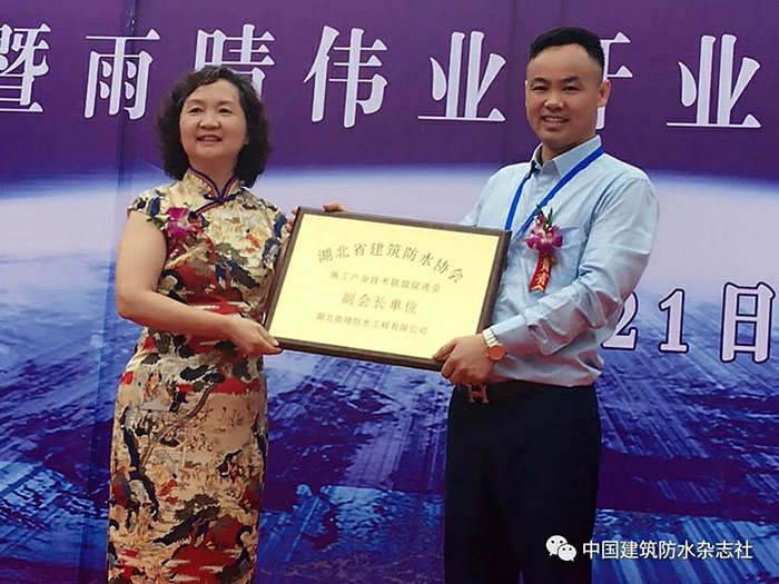 隨后,湖北防水協(xié)會會長桂春芳女士代表湖北防水協(xié)會在開業(yè)慶典大會上發(fā)表重要講話,她對湖北雨晴由最開始的施工企業(yè)轉型為防水系統(tǒng)服務商的工程進行了簡要介紹,并對之前雨晴承接的眾多國家大型、重點項目的防水工程予以肯定,并對雨晴在湖北乃至華中地區(qū)較高知名度,美譽度,影響力予以了肯定。她還說:當前,高質量發(fā)展是新時代的要求,也是防水行業(yè)新時代的使命,并希望雨晴集團在產品質量、工程質量和服務質量的管理上進一步做深做透做細,日益精進。心無旁騖造產品、一絲不茍干工程、全心全意做服務,使雨晴集團快速進入高質量高效益發(fā)展的康莊大道。之后授予雨晴公司“湖北省建筑防水協(xié)會施工產業(yè)技術聯(lián)盟促進會副會長單位”。